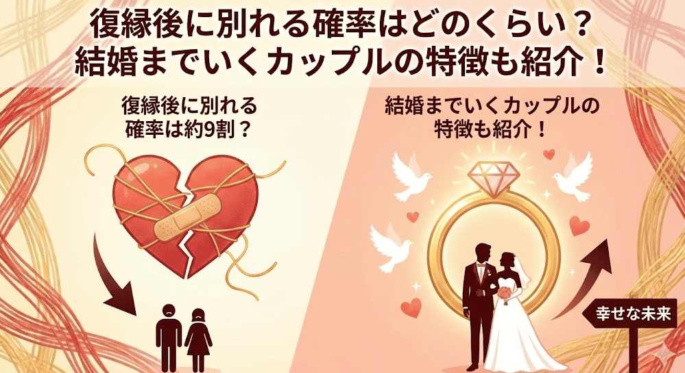 「復縁後に別れる確率はどのくらい?」 「復縁しても上手くいかないなら不安」 復縁したカップルが再度別れる確率は約9割と高い傾向にあります。 正直、この数字を見ると絶望しますよね。 しかし、裏を返せば「残りの1割」は確実に幸せな結婚までたどり着いているということです。 では、9割のカップルと、成功した1割のカップル、決定的な違いは何なのでしょうか? それは「愛情の深さ」ではありません。 「二人の間に『調整役(プロ)』がいたかどうか」です。 この記事では、復縁から結婚までたどり着いた体験...